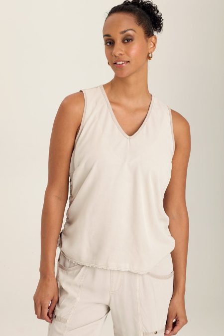 A pretty tank with unusual details. Ileana features a cinchable side seam with brass stopper and a contrast back panel. Taissa Twill: 70/30 Rayon/Tencel. Center Front: ~15.75″ Center Back: ~23″ Color Description: Light cloud grey Preshrunk Machine washable Imported MODEL August is wearing size XS Height: 5’9” | Bust: 35B…