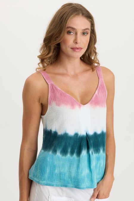A pretty tank with unusual details. Ileana features a cinchable side seam with brass stopper and a contrast back panel. Taissa Twill: 70/30 Rayon/Tencel. Center Front: ~15.75″ Center Back: ~23″ Color Description: Splatter and Striped blue, yellow and white tie dye Preshrunk Machine washable Imported MODEL August is wearing size…