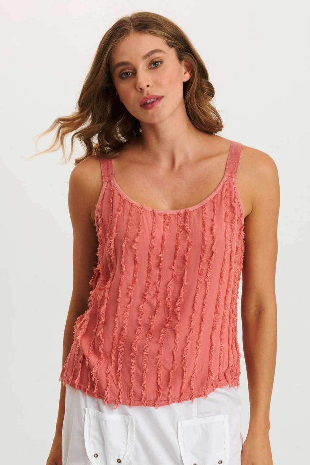 A fun new fabric graces the front of the Haddon Tank. A shredded stripe voile is center stage in this simple a-lined tank with twill tape straps and a contrast slub jersey back.