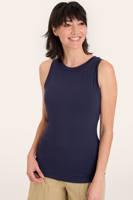 Classic as can be, Estine features a roomy silhouette with a raw-edge hem, bra-concealing straps, and v-neck cut in Lavish Linen. Lavish Linen: 78/22 Linen/Cotton 2×1 Rib Contrast: 95/5 Cotton/Spandex Center Front: ~15″ Center Back: ~21″ Color Description: Classic Sea Blue Preshrunk Machine washable Imported MODEL Aarika is wearing size XS…